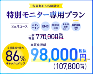 「100万はさすがに予算オーバー」という方でも、以下のモニター募集要項を満たすことで、キャッシュバックを受け、支払額を大幅に下げることが可能です。